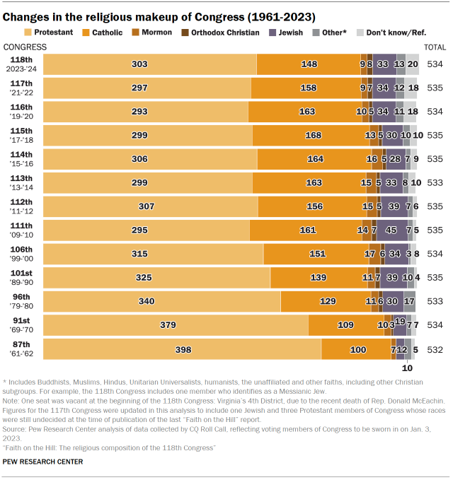 Ce nombre – inchangé par rapport à la 117e session – contraste fortement avec la part des chrétiens dans la population générale des États-Unis, qui, depuis 2007, est passée de 78 % à son niveau actuel de 63 %.